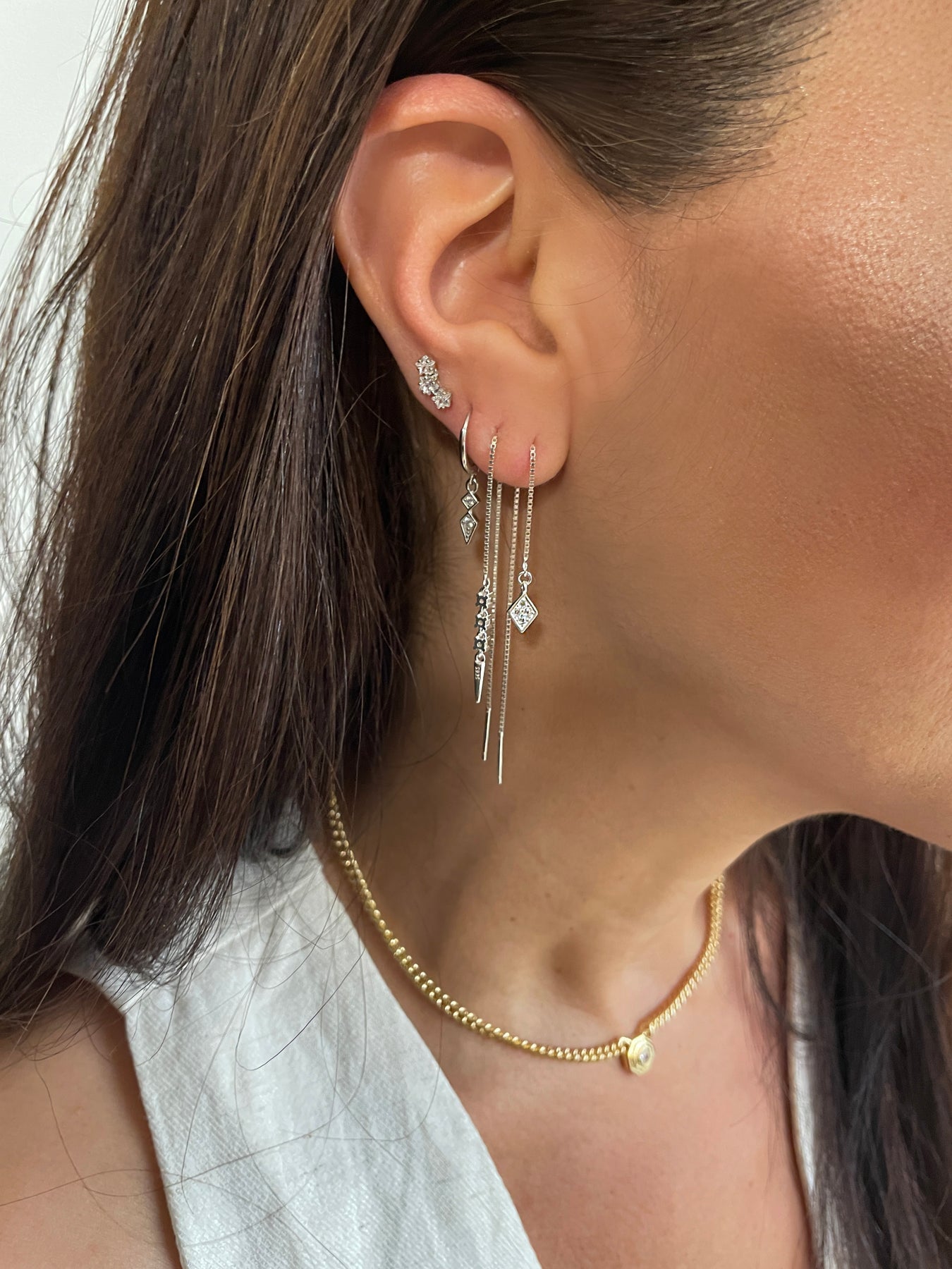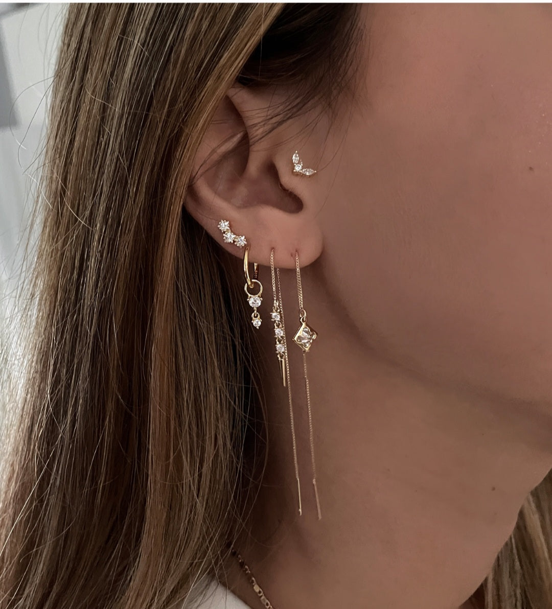 עגילים זהב צמודים משובצים שלושה זירקונים מעוצב כחצי עיגול.