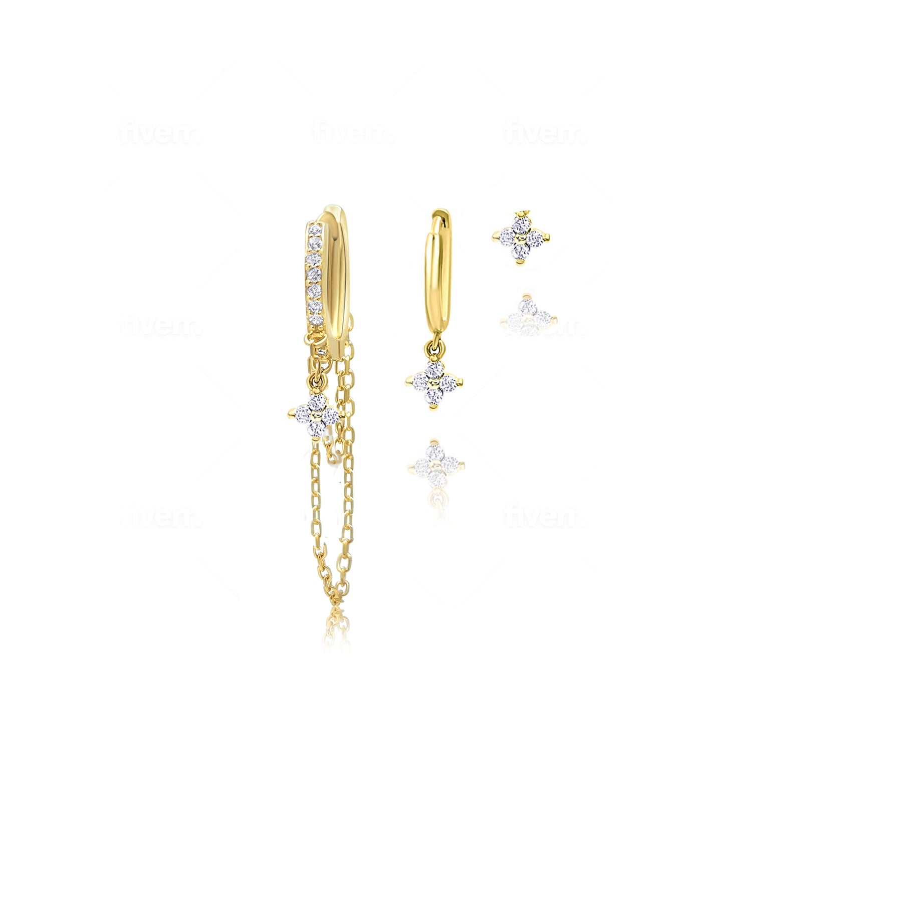 סט עגילי זהב עדין ומעוצב הכולל שלושה עגילים עדינים עם שרשרת ותילתן משובץ זירקונים שקופים, זהו סט מדורג היוצר אוזן מעוצבת עדינה ומרהיבה.